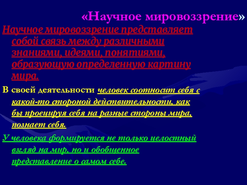 «Научное мировоззрение»Научное мировоззрение представляет собой связь между различными знаниями, идеями, понятиями, образующую определенную картину мира.В своей деятельности