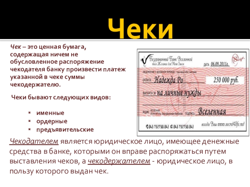 Чекодателем является юридическое лицо, имеющее денежные средства в банке, которыми он вправе распоряжаться путем выставления чеков, а чекодержателем - юридическое лицо, в пользу которого выдан чек.