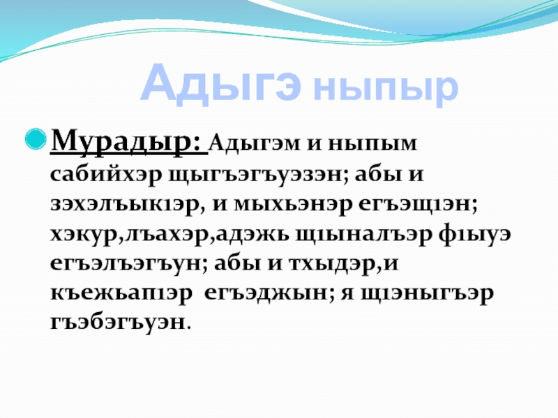 Мурадыр: Адыгэм и ныпым сабийхэр щыгъэгъуэзэн; абы и зэхэлъык1эр, и мыхьэнэр егъэщ1эн; хэкур,лъахэр,адэжь щ1ыналъэр ф1ыуэ егъэлъэгъун; абы и тхыдэр,и къежьап1эр егъэджын; я щ1эныгъэр гъэбэгъуэн.