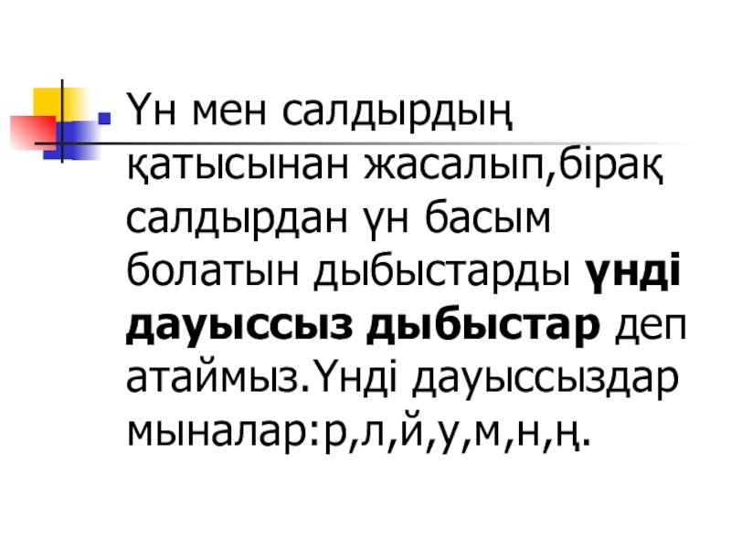 дауыссыз дыбыстар деп атаймыз.Үнді дауыссыздар мыналар:р,л,й,у,м,н,ң.