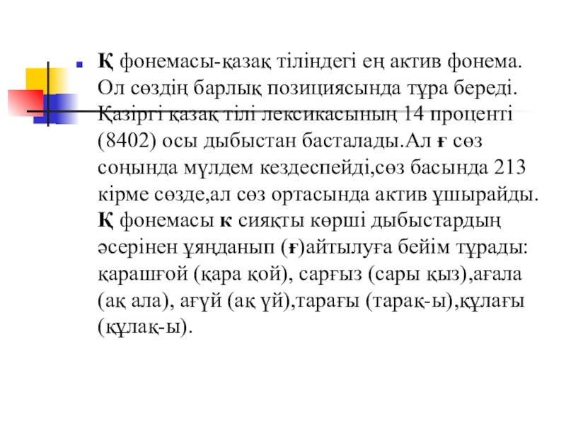 Қ фонемасы-қазақ тіліндегі ең актив фонема.Ол сөздің барлық позициясында тұра береді.Қазіргі