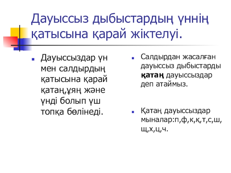 Слайд 6Дауыссыз дыбыстардың үннің қатысына қарай жіктелуі.