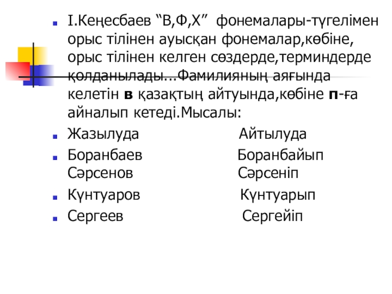 Слайд 16І.Кеңесбаев “В,Ф,Х” фонемалары-түгелімен орыс тілінен ауысқан фонемалар,көбіне,орыс тілінен келген сөздерде,терминдерде қолданылады...Фамилияның
