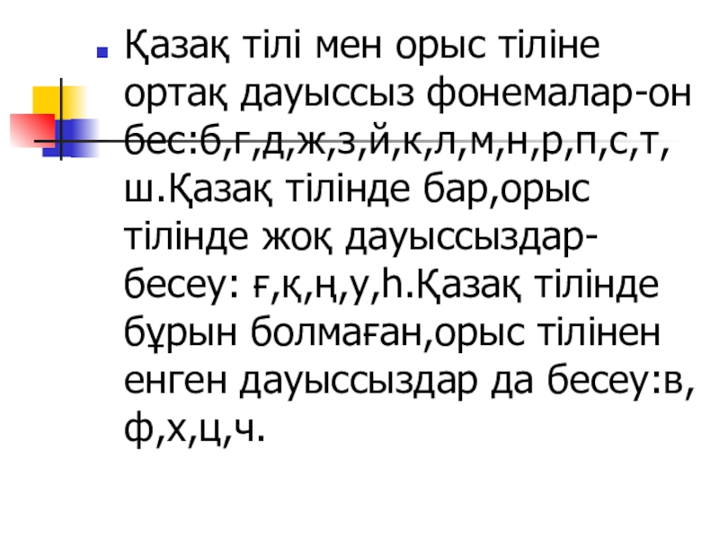 Слайд 21Қазақ тілі мен орыс тіліне ортақ дауыссыз фонемалар-он бес:б,г,д,ж,з,й,к,л,м,н,р,п,с,т,ш.Қазақ тілінде бар,орыс