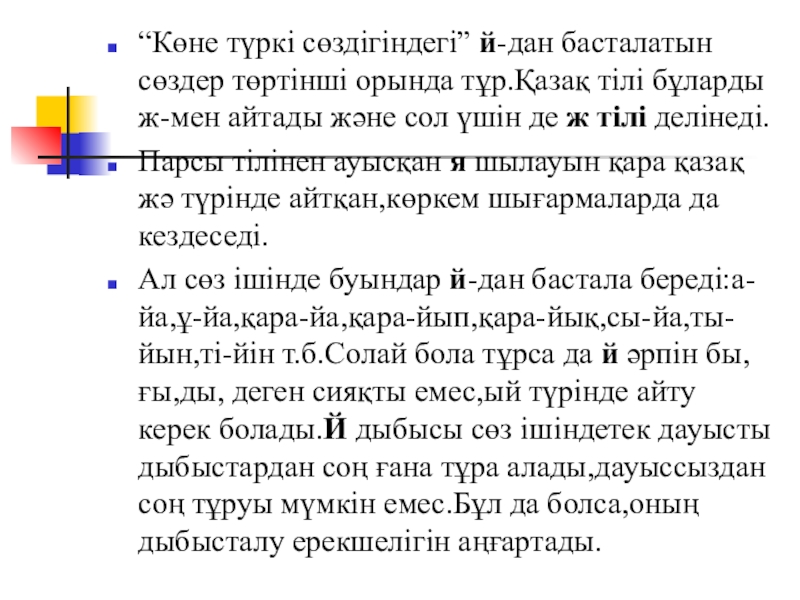 Слайд 18“Көне түркі сөздігіндегі” й-дан басталатын сөздер төртінші орында тұр.Қазақ тілі бұларды