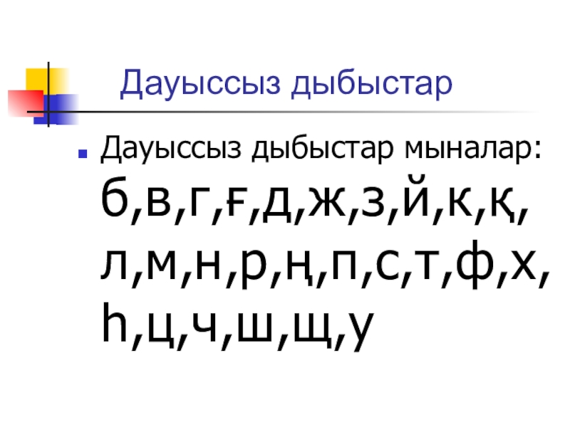 Дауыссыз дыбыстар мыналар:б,в,г,ғ,д,ж,з,й,к,қ,л,м,н,р,ң,п,с,т,ф,х,һ,ц,ч,ш,щ,у