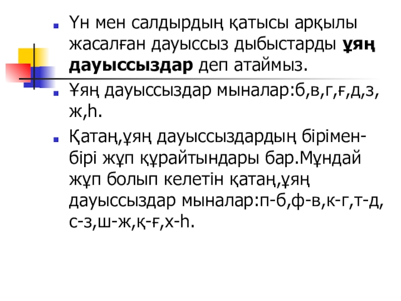 Слайд 8Үн мен салдырдың қатысы арқылы жасалған дауыссыз дыбыстарды ұяң дауыссыздар деп