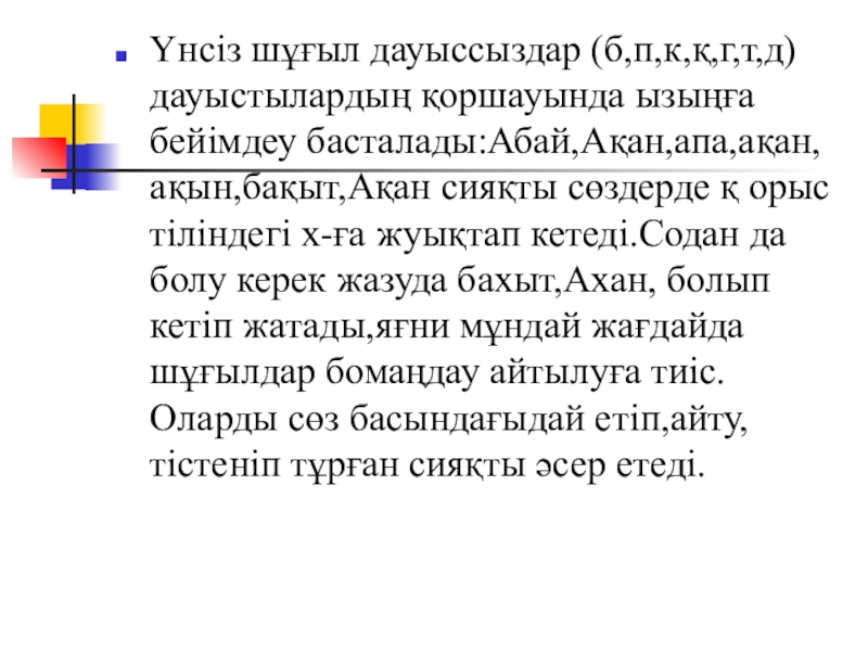 Слайд 17Үнсіз шұғыл дауыссыздар (б,п,к,қ,г,т,д)дауыстылардың қоршауында ызыңға бейімдеу басталады:Абай,Ақан,апа,ақан,ақын,бақыт,Ақан сияқты сөздерде қ