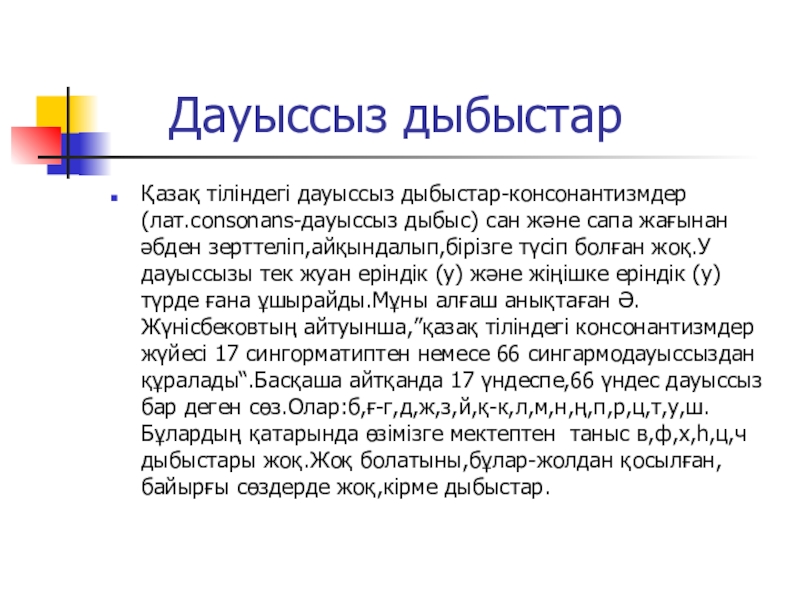 Қазақ тіліндегі дауыссыз дыбыстар-консонантизмдер (лат.consonans-дауыссыз дыбыс) сан