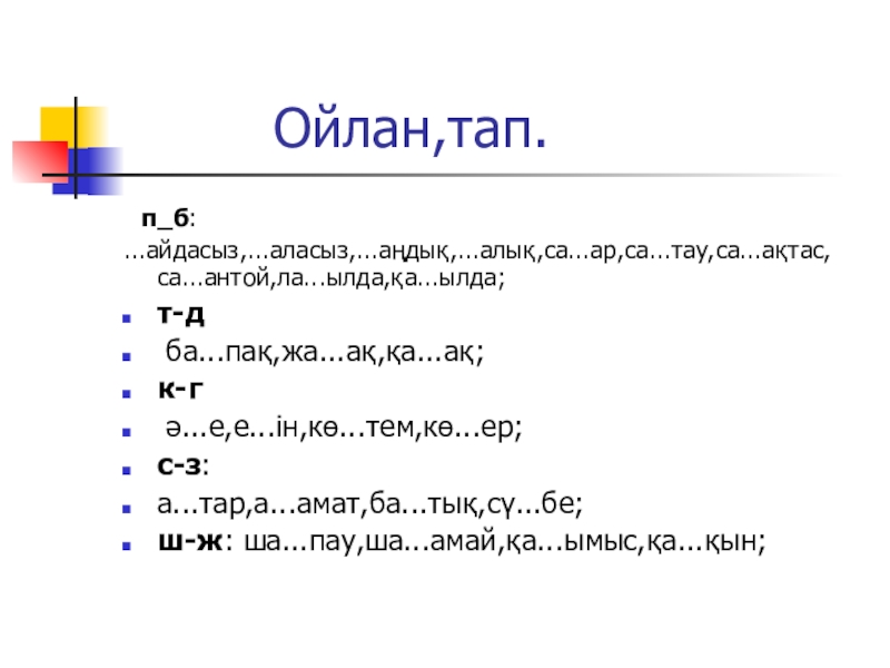 ...айдасыз,...аласыз,...аңдық,...алық,са...ар,са...тау,са...ақтас,са...антой,ла...ылда,қа...ылда;
