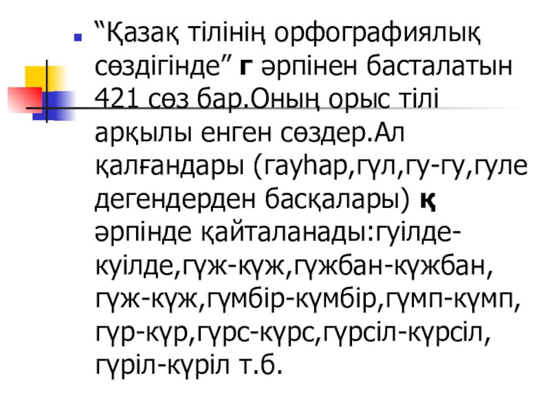 Слайд 15“Қазақ тілінің орфографиялық сөздігінде” г әрпінен басталатын 421 сөз бар.Оның орыс