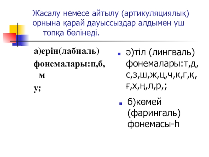 Слайд 11Жасалу немесе айтылу (артикуляциялық) орнына қарай дауыссыздар алдымен үш топқа бөлінеді.