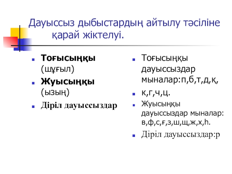 Слайд 10Дауыссыз дыбыстардың айтылу тәсіліне қарай жіктелуі.