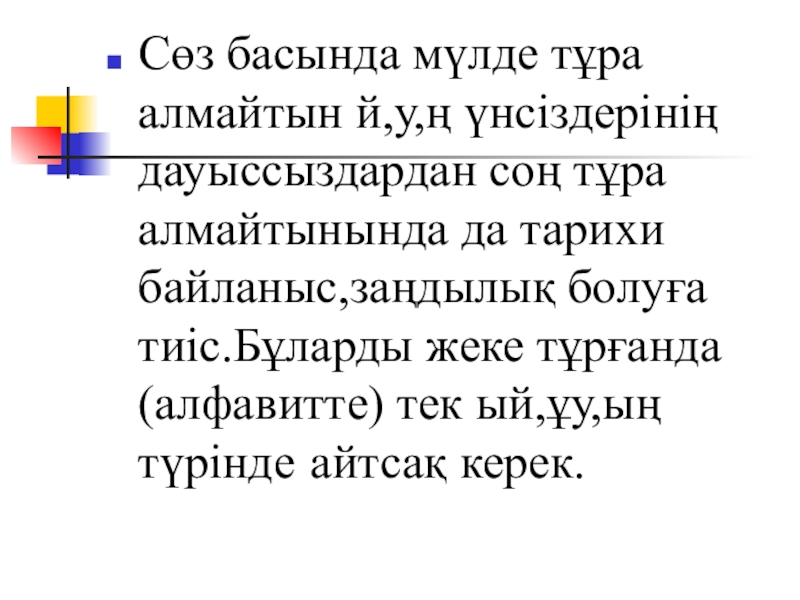 Слайд 19Сөз басында мүлде тұра алмайтын й,у,ң үнсіздерінің дауыссыздардан соң тұра алмайтынында