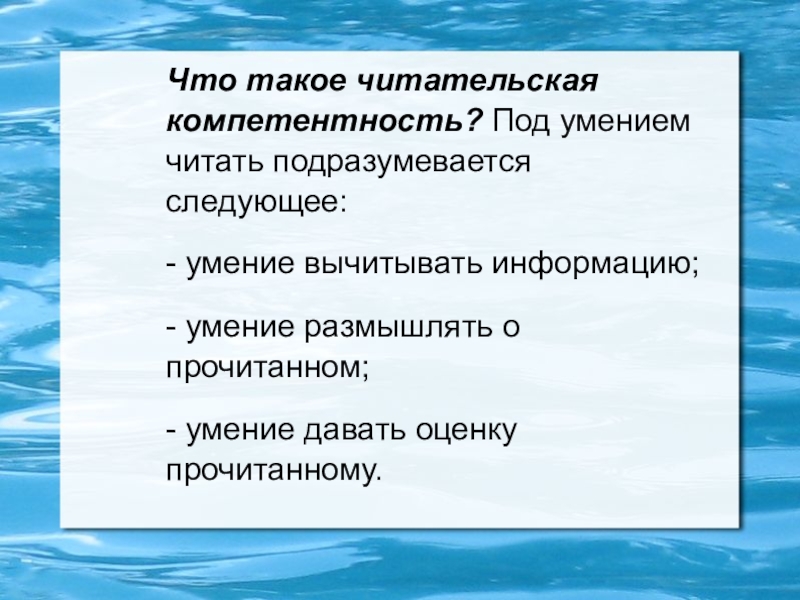 Слайд 5Что такое читательская компетентность? Под умением читать подразумевается следующее: