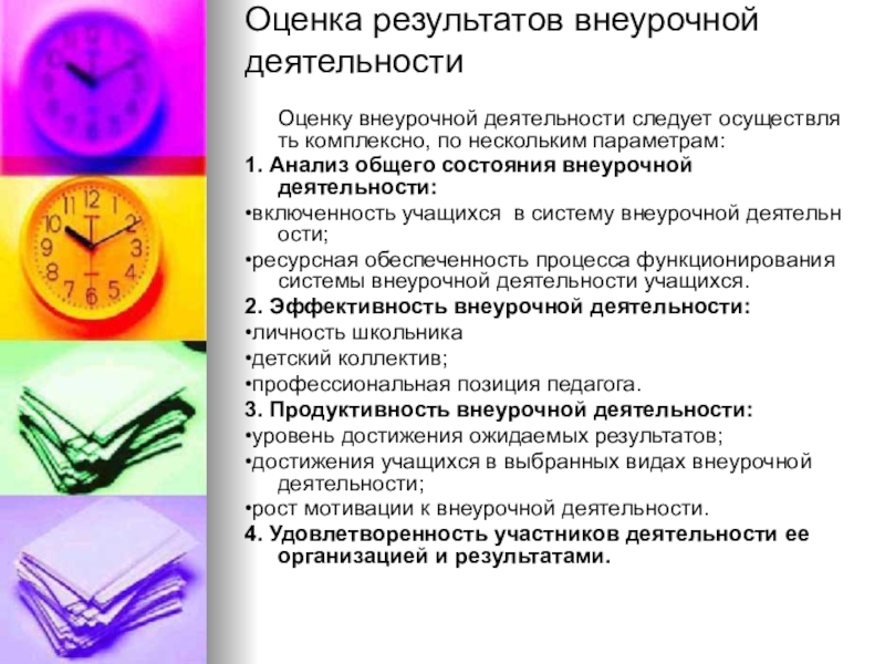 Оценку внеурочной деятельности следует осуществлять комплексно, по нескольким параметрам: