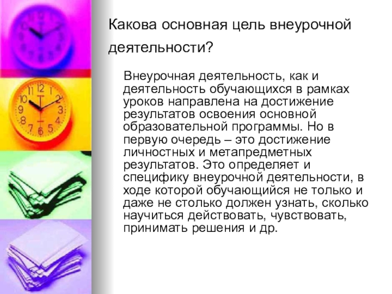 и деятельность обучающихся в рамках уроков направлена на достижение результатов освоения основной образовательной программы. Но в первую очередь – это достижение личностных и метапредметных результатов. Это определяет и специфику внеурочной деятельности, в ходе которой обучающийся не только и даже не столько должен узнать, сколько научиться действовать, чувствовать, принимать решения и др.