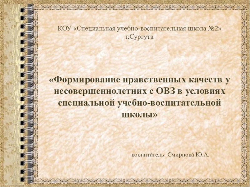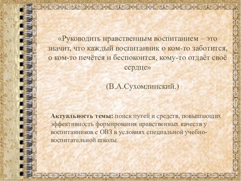 Актуальность темы: поиск путей и средств, повышающих эффективность формирования нравственных качеств у воспитанников с ОВЗ в условиях специальной учебно-воспитательной школы.