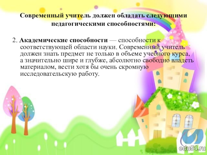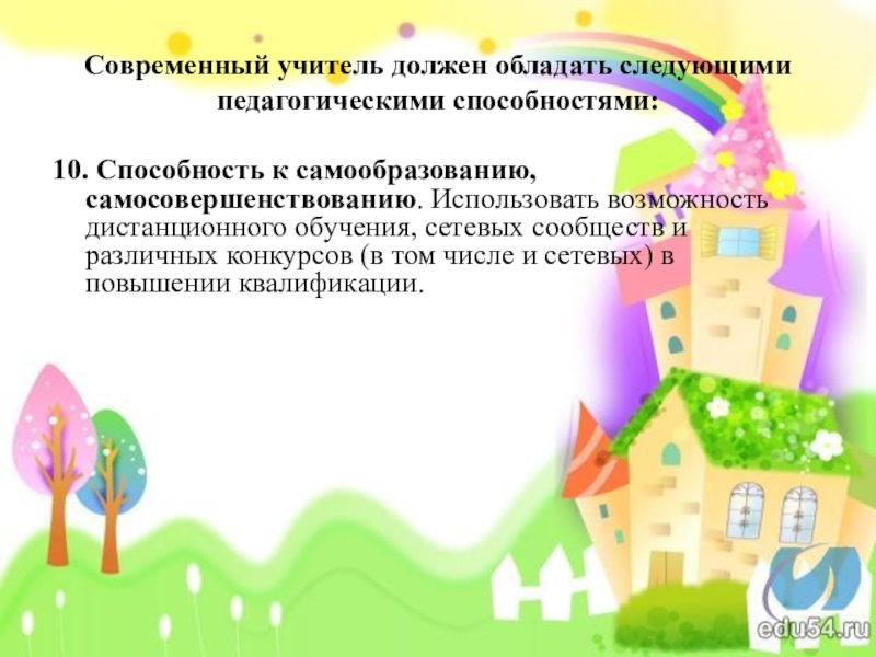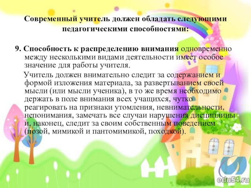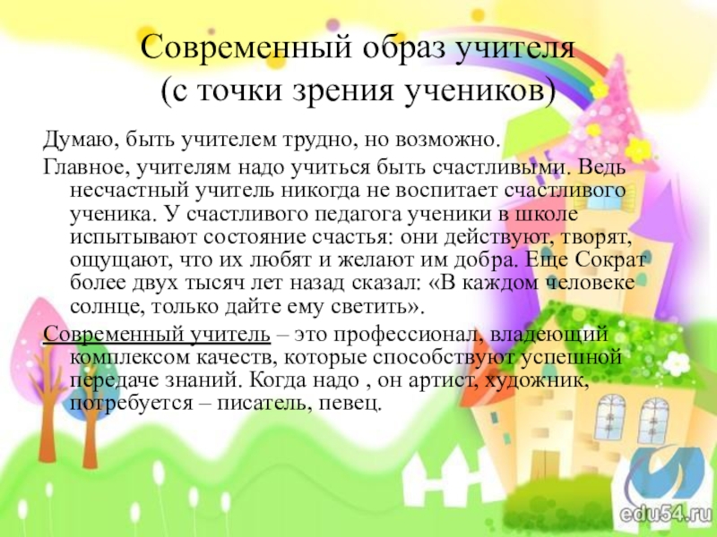 Современный учитель – это профессионал, владеющий комплексом качеств, которые способствуют успешной передаче знаний. Когда надо , он артист, художник, потребуется – писатель, певец.