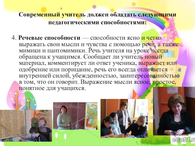 ясно и четко выражать свои мысли и чувства с помощью речи, а также мимики и пантомимики. Речь учителя на уроке всегда обращена к учащимся. Сообщает ли учитель новый материал, комментирует ли ответ ученика, выражает или одобрение или порицание, речь его всегда отличается внутренней силой, убежденностью, заинтересованностью в том, что он говорит. Выражение мысли ясное, простое, понятное для учащихся.