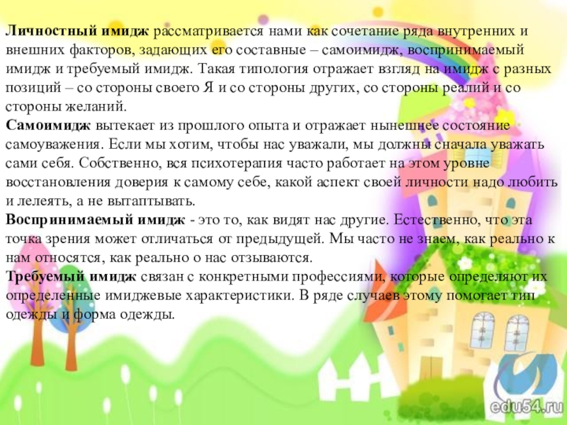 80-х годов. В переводе с французского языка «имидж» – это искусственный целенаправленный образ, слагаемый из многих факторов. Над его созданием работают психологи, социологи, стилисты, визажисты. Когда говорят об имидже человека, то имеют в виду: