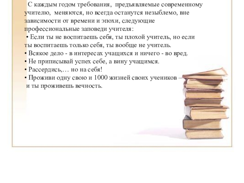 каждым годом требования, предъявляемые современному учителю, меняются, но всегда останутся незыблемо, вне зависимости от времени и эпохи, следующие профессиональные заповеди учителя:
