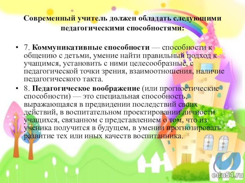 8. Педагогическое воображение (или прогностические способности) — это специальная способность, выражающаяся в предвидении последствий своих действий, в воспитательном проектировании личности учащихся, связанном с представлением о том, что из ученика получится в будущем, в умении прогнозировать развитие тех или иных качеств воспитанника.