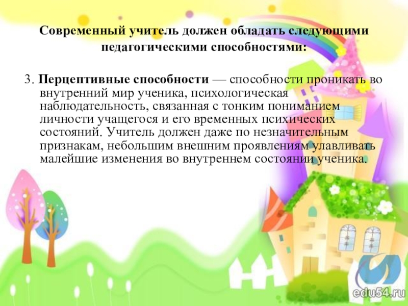 проникать во внутренний мир ученика, психологическая наблюдательность, связанная с тонким пониманием личности учащегося и его временных психических состояний. Учитель должен даже по незначительным признакам, небольшим внешним проявлениям улавливать малейшие изменения во внутреннем состоянии ученика.