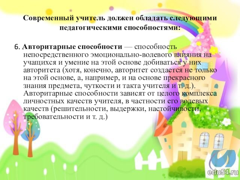 непосредственного эмоционально-волевого влияния на учащихся и умение на этой основе добиваться у них авторитета (хотя, конечно, авторитет создается не только на этой основе, а, например, и на основе прекрасного знания предмета, чуткости и такта учителя и т. д.). Авторитарные способности зависят от целого комплекса личностных качеств учителя, в частности его волевых качеств (решительности, выдержки, настойчивости, требовательности и т. д.)