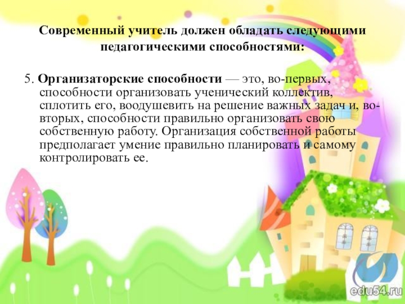 во-первых, способности организовать ученический коллектив, сплотить его, воодушевить на решение важных задач и, во-вторых, способности правильно организовать свою собственную работу. Организация собственной работы предполагает умение правильно планировать и самому контролировать ее.