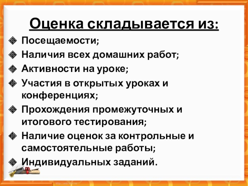 Оценка складывается из:Посещаемости;Наличия всех домашних работ;Активности на уроке;Участия в открытых уроках и конференциях;Прохождения промежуточных и итогового тестирования;Наличие оценок за контрольные и самостоятельные работы;Индивидуальных заданий.