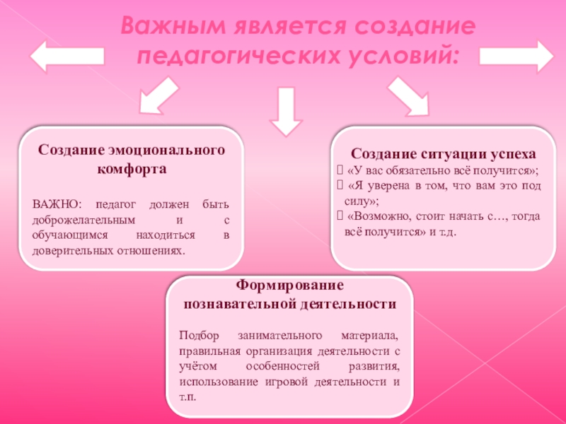 Подбор занимательного материала, правильная организация деятельности с учётом особенностей развития, использование игровой деятельности и т.п.