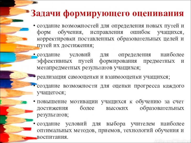 Задачи формирующего оцениваниясоздание возможностей для определения новых путей и форм обучения, исправления ошибок учащихся, корректировки поставленных образовательных