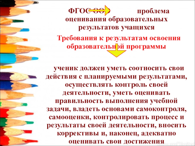 ФГОС ООО проблема оценивания образовательных результатов учащихся Требования к результатам освоения образовательной программы ученик должен уметь соотносить свои действия с планируемыми результатами, осуществлять контроль своей деятельности, уметь оценивать правильность выполнения учебной