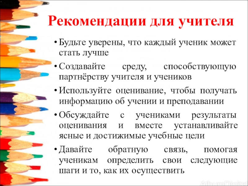 Рекомендации для учителяБудьте уверены, что каждый ученик может стать лучшеСоздавайте среду, способствующую партнёрству учителя и учениковИспользуйте оценивание,