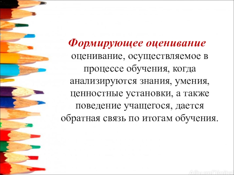 Формирующее оценивание оценивание, осуществляемое в процессе обучения, когда анализируются знания, умения, ценностные установки, а также поведение учащегося,