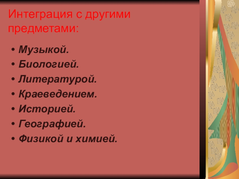 Интеграция с другими предметами:Музыкой.Биологией.Литературой.Краеведением.Историей.Географией.Физикой и химией.