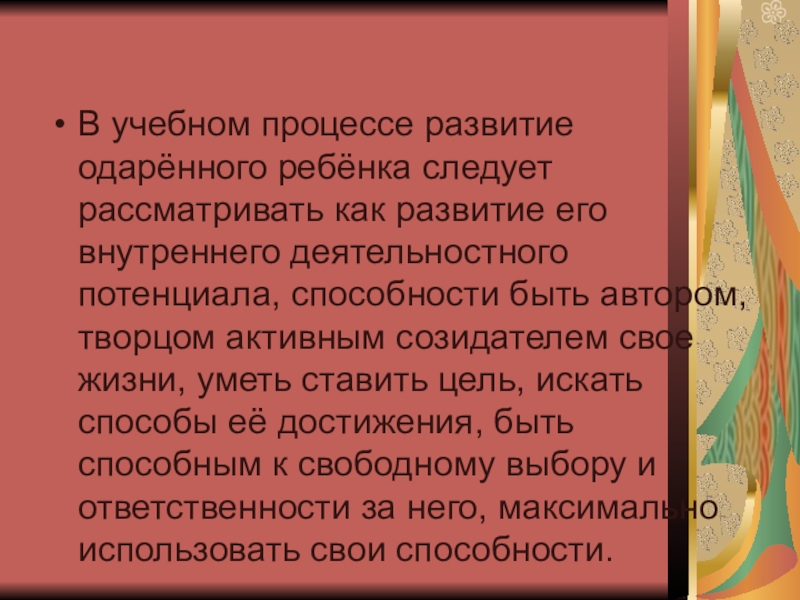 В учебном процессе развитие одарённого ребёнка следует рассматривать как развитие его внутреннего деятельностного потенциала, способности быть автором,
