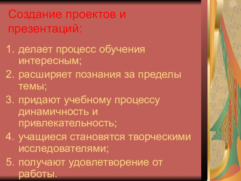 Создание проектов и презентаций:делает процесс обучения интересным;расширяет познания за пределы темы;придают учебному процессу динамичность и привлекательность;учащиеся становятся