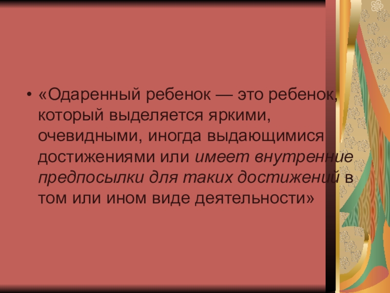 «Одаренный ребенок — это ребенок, который выделяется яркими, очевидными, иногда выдающимися достижениями или имеет внутренние предпосылки для таких достижений в том или ином виде деятельности»