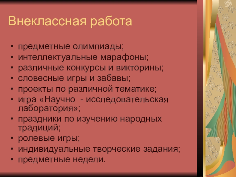 Внеклассная работапредметные олимпиады; интеллектуальные марафоны; различные конкурсы и викторины; словесные игры и забавы; проекты по различной тематике;