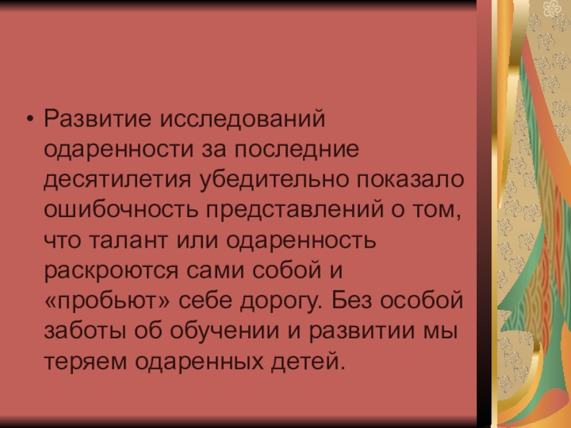 Развитие исследований одаренности за последние десятилетия убедительно показало ошибочность представлений о том, что талант или одаренность раскроются