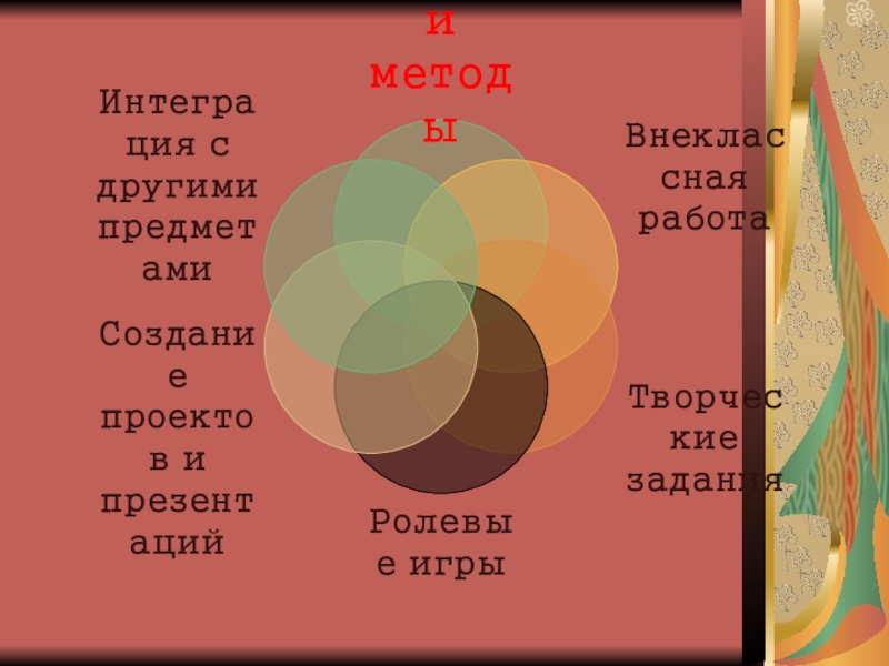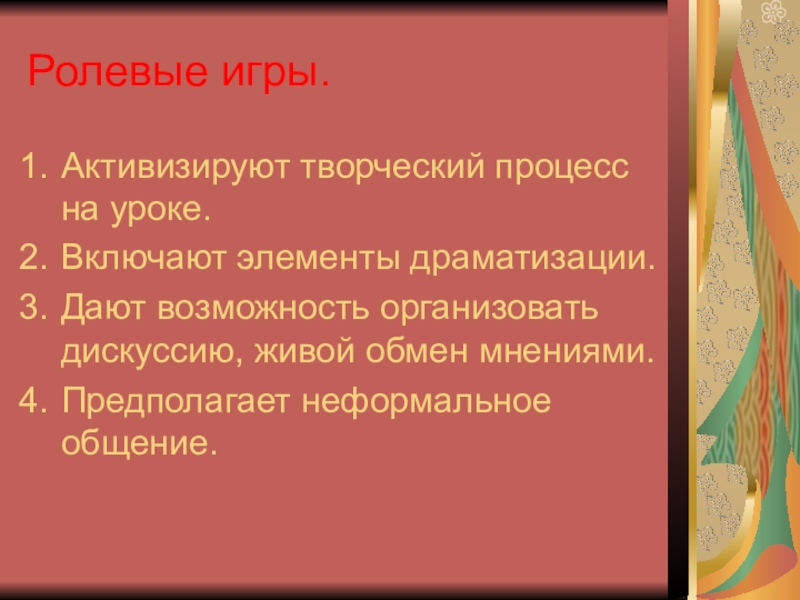 Ролевые игры.Активизируют творческий процесс на уроке.Включают элементы драматизации.Дают возможность организовать дискуссию, живой обмен мнениями.Предполагает неформальное общение.