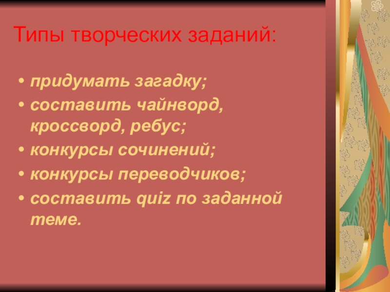 Типы творческих заданий:придумать загадку;составить чайнворд, кроссворд, ребус;конкурсы сочинений;конкурсы переводчиков;составить quiz по заданной теме.