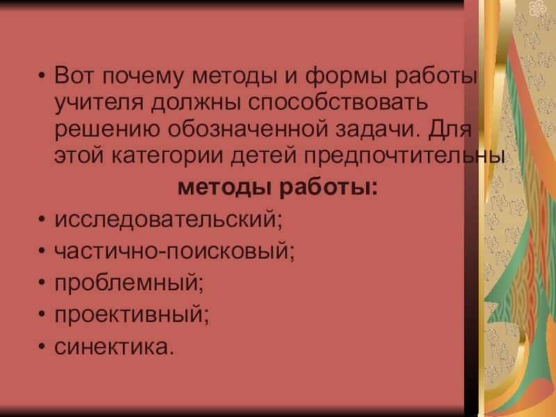 Вот почему методы и формы работы учителя должны способствовать решению обозначенной задачи. Для этой категории детей предпочтительны