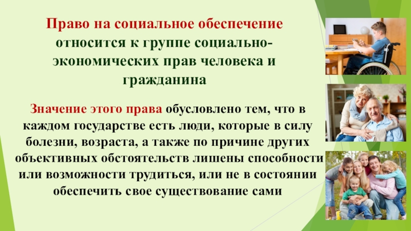 Значение этого права обусловлено тем, что в каждом государстве есть люди, которые в силу болезни, возраста, а также по причине других объективных обстоятельств лишены способности или возможности трудиться, или не в состоянии обеспечить свое существование сами