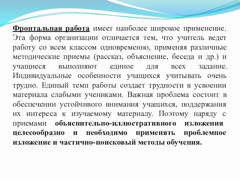 Слайд 5Фронтальная работа имеет наиболее широкое применение. Эта форма организации отличается тем,