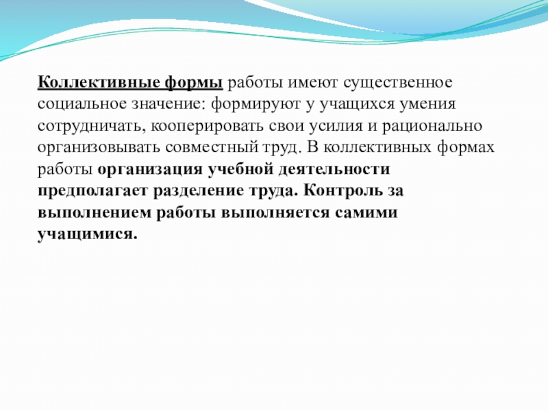 Слайд 6Коллективные формы работы имеют существенное социальное значение: формируют у учащихся умения