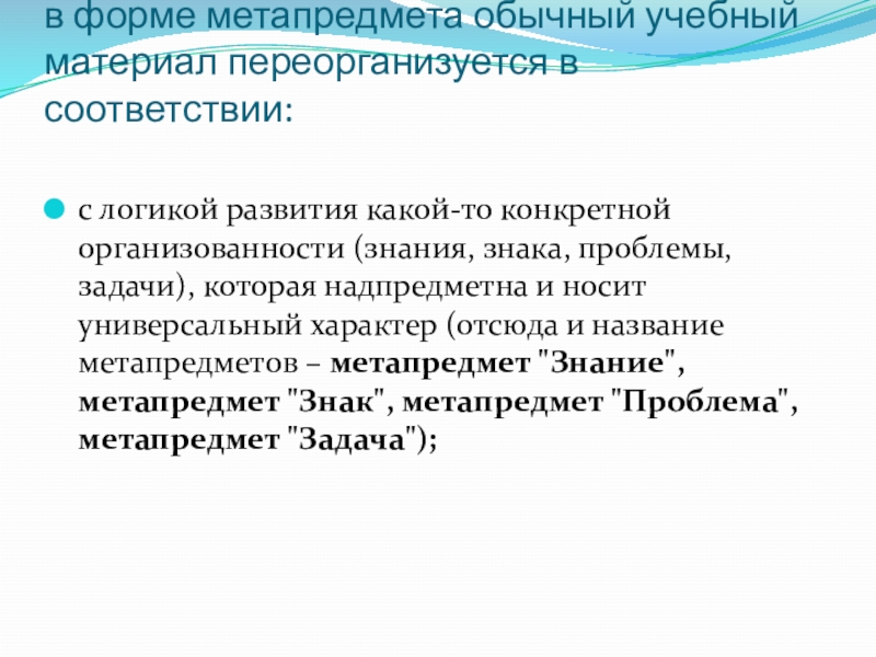 Слайд 25в форме метапредмета обычный учебный материал переорганизуется в соответствии: