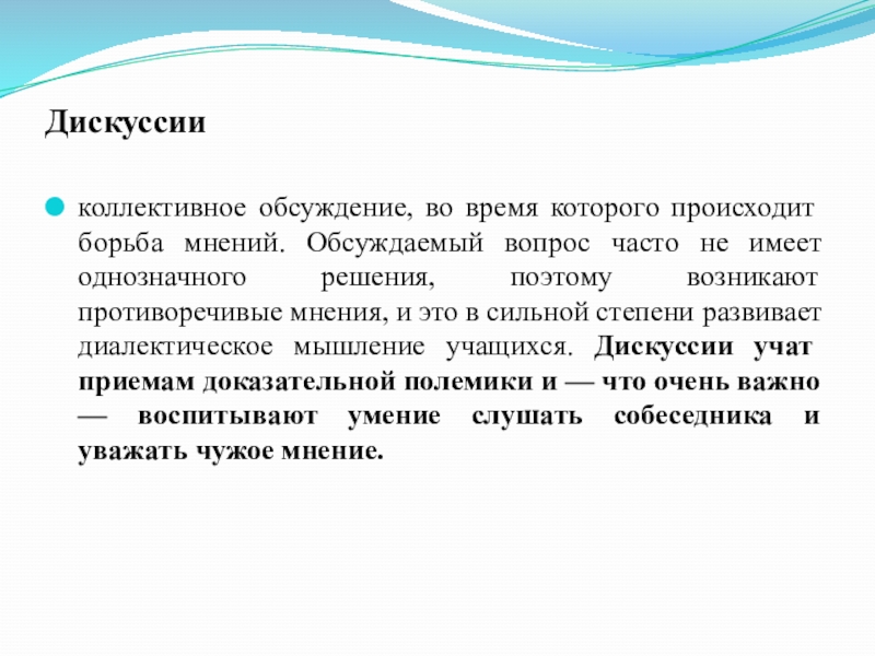 не имеет однозначного решения, поэтому возникают противоречивые мнения, и это в сильной степени развивает диалектическое мышление учащихся. Дискуссии учат приемам доказательной полемики и — что очень важно — воспитывают умение слушать собеседника и уважать чужое мнение.